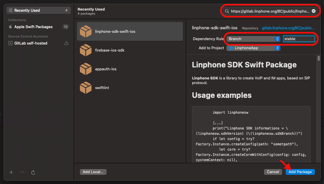 By default, the app uses a remote SPM repository: https://gitlab.linphone.org/BC/public/linphone-sdk-swift-ios.git